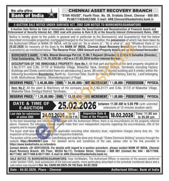 DESCRIPTION OF THE IMMOVABLE PROPERTY: Item No.1: All that part and parcel of the land property situated at S.No.317/1 and S.No. 317/2 of Nilakottai Village, Nilakottai Taluk, Dindigul District, Tamilnadu including Factory Buildings and Sheds constructed there on admeasuring 2 acres, 88 cents. (2 storied building and 5 sheds) within the following boundaries Boundaries: North by: Common Odai, South by: Nelco Metal Factory, East by: Land belonging to Mr. Muthuthevar, West by: Meenakshipuram LF Road