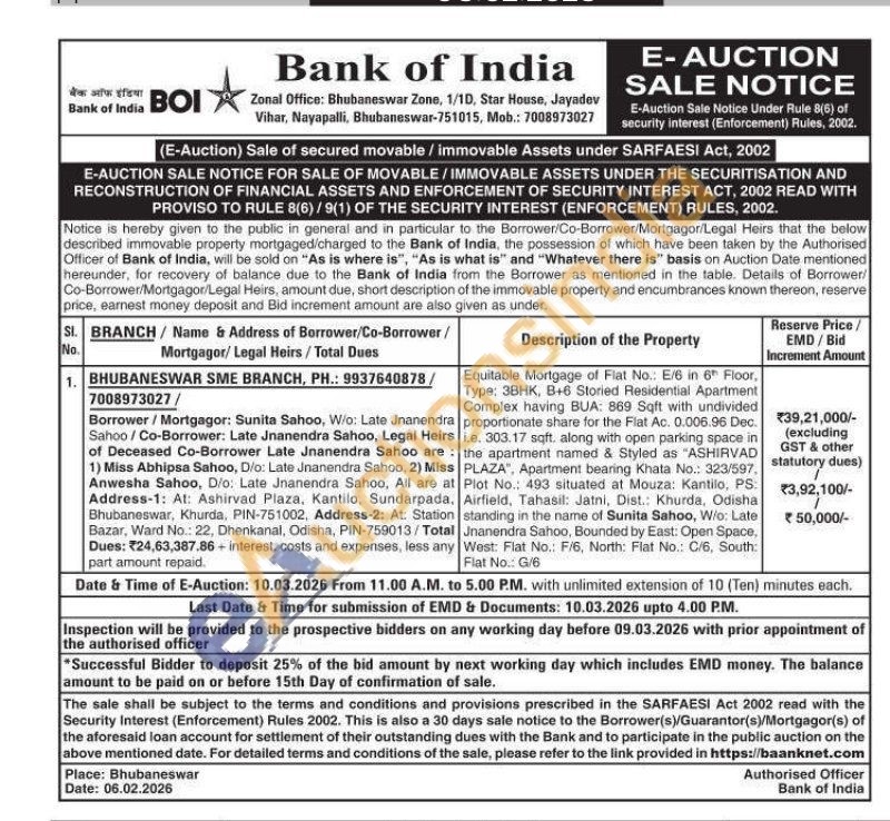Equitable Mortgage of Flat No.: E/6 in 6th Floor, Type: 3BHK, B+6 Storied Residential Apartment Complex having BUA: 869 Sqft with undivided proportionate share for the Flat Ac. 0.006.96 Dec. i.e. 303.17 sqft. along with open parking space in the apartment named & Styled as "ASHIRVAD PLAZA", Apartment bearing Khata No.: 323/597, Plot No.: 493 situated at Mouza: Kantilo, PS: Airfield, Tahasil: Jatni, Dist.: Khurda, Odisha standing in the name of Sunita Sahoo, W/o: Late Jnanendra Sahoo, Bounded by East: Open Space, West: Flat No.: F/6, North: Flat No.: C/6, South: Flat No.: G/6