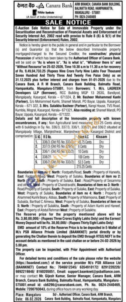 Non Agricultural land measuring 215.25 Cents along with 6 buildings in Sy. No. 336/3, 337/3, 336/1, 338/21 and 336/2 situated at Mangalpady Village, Manjeshwar, Manjeshwar Taluk, Kasargod District and comprised in:Boundaries of item no 1: North: Footpath Road, South: Property of Haneefa, East: Footpath/Road, West: Property of Sulaika, Boundaries of item no 2: North Road, South: Property of Sulaika, East: Road/Property of Sesamта and others, West: Property of Chandravathi, Boundaries of item no 3: North: Road/Property of Sarojini, South: Property of Sulaika, East: Property of Sulaika, West: Property of Sulaika, Boundaries of item no 4: North: Property of Ahammed Kunhi Beary, Abbas, South: Property of Maimoona, East: Property of Subaida, Barthad C Almesa, West: Property of Sulaika, Boundaries of item no 5: North: Property of Sulaikha, South: Property of Adam Kunhi and Haneef, East: Property of Abdul Rehman West: Property of Sulaikha.