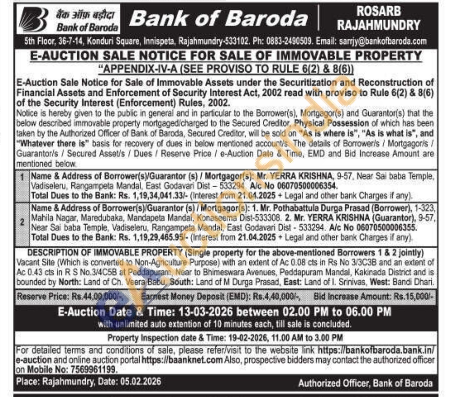 Vacant Site (Which is converted to Non-Agriculture Purpose) with an extent of Ac 0.08 cts in Rs No 3/3C3B and an extent of Ac 0.43 cts in R S No.3/4C5B at Peddapuram, Near to Bhimeswara Avenues, Peddapuram Mandal, Kakinada District and is bounded by North: Land of Ch. Veera Babu, South: Land of M Durga Prasad, East: Land of I. Srinivas, West: Bandi Dhari