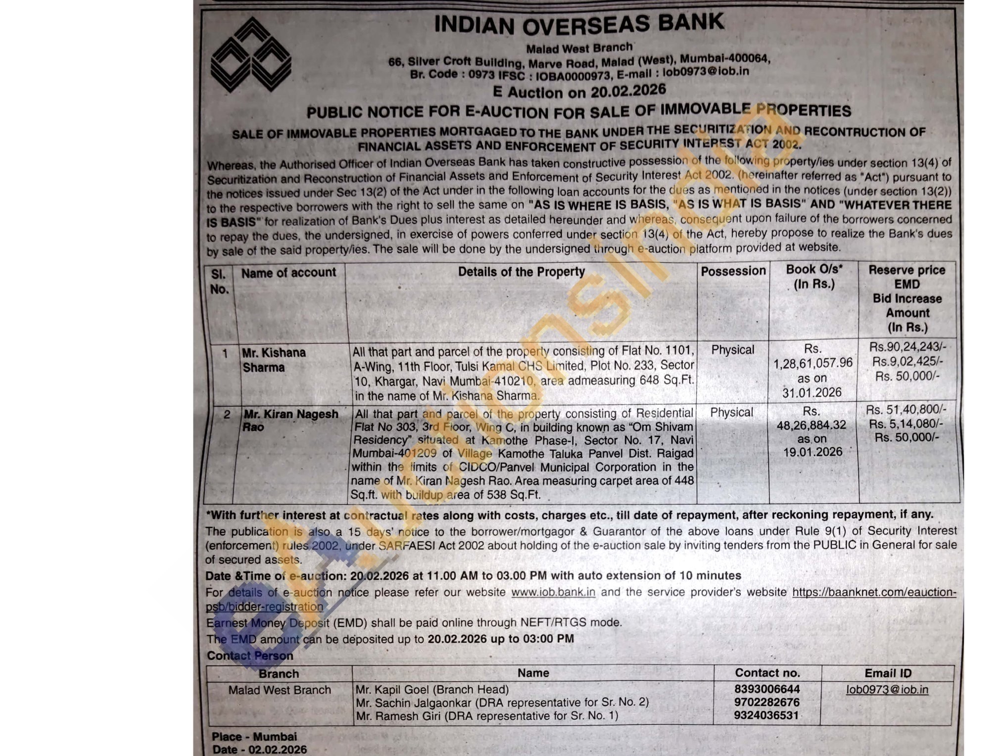 All that part and parcel of the property consisting of Residential Flat No 303, 3rd Floor, Wing C, in building known as "Om Shivam Residency situated at Kamothe Phase-1, Sector No. 17, Navi Mumbai-401209 of Village Kamothe Taluka Panvel Dist. Raigad within the limits of CIDCO/Panvel Municipal Corporation in the name of Mr. Kiran Nagesh Rao. Area measuring carpet area of 448 Sq.ft. with buildup area of 538 Sq.Ft.