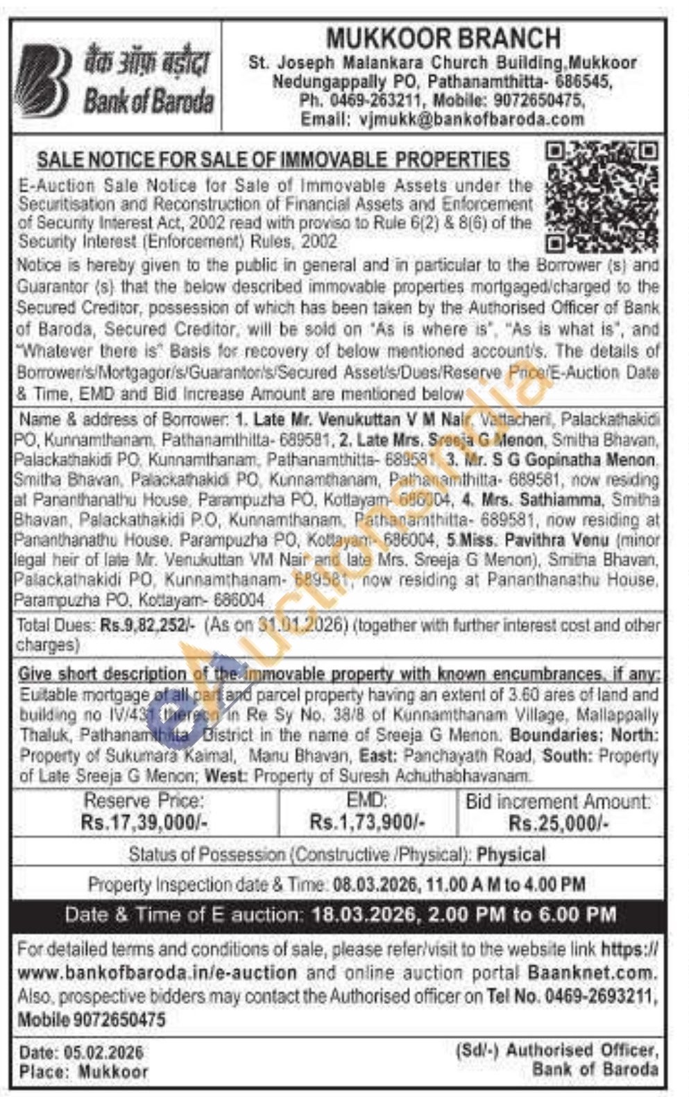 Euitable mortgage of all part and parcel property having an extent of 3.60 ares of land and building no IV/431 thereon in Re Sy No. 38/8 of Kunnamthanam Village, Mallappally Thaluk, Pathanamthitta District in the name of Sreeja G Menon. Boundaries: North: Property of Sukumara Kaimal, Manu Bhavan, East: Panchayath Road, South: Property of Late Sreeja G Menon; West: Property of Suresh Achuthabhavanam