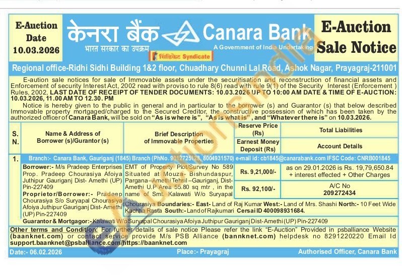 EMT of Property Plot/Survey No 589 Situated at Mouza Bishundaspur, Pargana-Amethi Tehsil -Gauriganj, Dist-Amethi U.P Area 55.80 sq mtr, in the name of Smt. Kalawati W/o Suryapal Chourasiya Boundaries:- East-Land of Raj Kumar West:- Land of Mrs. Shashi North:- 10 Feet Wide Kachha Rasta South: Land of Rajkumari