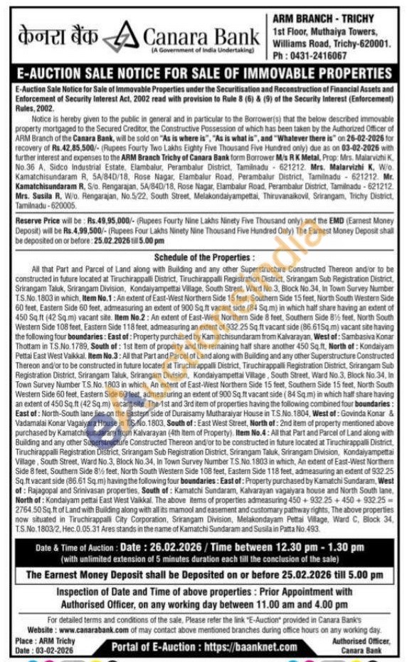 All that Part and Parcel of Land along with Building and any other Superstructure Constructed Thereon and/or to be constructed in future located at Tiruchirappalli District, Tiruchirappalli Registration District, Srirangam Sub Registration District, Srirangam Taluk, Srirangam Division, Kondaiyampettai Village, South Street, Ward No. 3, Block No. 34, In Town Survey Number T.S.No. 1803 in which, Item No.1: An extent of East-West Northern Side 15 feet, Southern Side 15 feet, North South Western Side 60 feet, Eastern Side 60 feet, admeasuring an extent of 900 Sq.ft vacant side (84 Sq.m) in which half share having an extent of 450 Sq.ft (42 Sq.m) vacant site. Item No.2: An extent of East-West Northern Side 8 feet, Southern Side 85% feet, North South Western Side 108 feet, Eastern Side 118 feet, admeasuring an extent of 932.25 Sq.ft vacant side (86.615q.m) vacant site having the following four boundaries: East of: Property purchased by Kamalchisundaram from Kalvarayan, West of: Sambasiva Konar Thottam in TS.No. 1789, South of: 1st item of property and the remaining half share another 450 Sq.ft. North of: Kondaiyam Pettai East West Vaikkal. Item No.3: All that Part and Parcel of Land along with Building and any other Superstructure Constructed Thereon and/or to be constructed in future located at Tiruchirappalli District, Tiruchirappalli Registration District, Srirangam Sub Registration District, Srirangam Taluk, Srirangam Division, Kondaiyampettai Village, South Street, Ward No.3, Block No.34, In Town Survey Number T.S.No. 1803 in which, An extent of East-West Northern Side 15 feet, Southern Side 15 feet, North South Western Side 60 feet, Eastern Side 60 feet, admeasuring an extent of 900 Sq.ft vacant side (84 Sq.m) in which half share having an extent of 450 Sq.ft (42 Sq.m) vacant site. The 1st and 3rd item of properties having the following combined four boundaries: East of: North-South lane lies on the Eastern side of Duraisamy Mutharaiyar House in T.S.No. 1804, West of: Govinda Konar & Vadamalai Konar Vagaiyara House in T.S.No. 1803, South of: East West Street, North of: 2nd item of property mentioned above purchased by Kamatchisundaram from Kalvarayan (4th item of Property). Item No.4: All that Part and Parcel of Land along with Building and any other Superstructure Constructed Thereon and/or to be constructed in future located at Tiruchirappalli District, Tiruchirappalli Registration District, Srirangam Sub Registration District, Srirangam Taluk, Srirangam Division, Kondaiyampettai Village, South Street, Ward No.3, Block No.34, In Town Survey Number T.S.No. 1803 in which, An extent of East-West Northern Side 8 feet, Southern Side 816 feet, North South Western Side 108 feet, Eastern Side 118 feet, admeasuring an extent of 932.25 Sq.ft vacant side (86.61 Sq.m) having the following four boundaries: East of: Property purchased by Kamatchi Sundaram, West of: Rajagopal and Srinivasan properties, South of: Kamatchi Sundaram, Kalvarayan vagalyara house and North South lane, North of: Kondaiyam pettai East West Vaikkal. The above items of properties admeasuring 450+932.25+450+932.25-2764.50 Sq.ft of Land with Building along with all its mamool and easement and customary pathway rights, The above properties now situated in Tiruchirappalli City Corporation, Srirangam Division, Melakondayam Pettai Village, Ward C, Block 34, TS No. 1803/2, Hec.0.05.31 Ares stands in the name of Kamatchi Sundaram and Susila in Patta No. 493