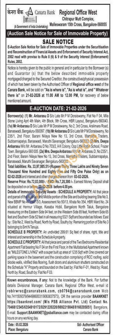 Details of Immovable Security Assets: SCHEDULE A PROPERTY: All that piece and parcel of the Northem and Middle portion of the Site and building bearing Site No.3, New BBMP No 471/53/13/3, Assessment No 50/13, Khata No 354, HBR Ward No. 24 situated at Hennur Village, Kasaba Hobli, Bangalore North Taluk, Bangalore measuring on the Eastern Side 94 feet, on the Western Side 85 feet, Northerm Side 65 feet and Southem Side 52 feet in all measuring 5321 Sqft and bounded as follows: East by: Site No 2, West by Road, North by Road, Southy by: Remaning portion of Site No 3 belonging to Smt N Tanuja
