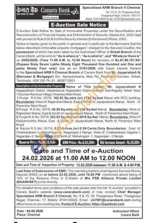Name of Title holder: Mr. Jayaprakash N Nagapattinam District, Mayiladuturai Registration District Kollidam Sub-Registry, Sirkali Taluk, 7: Kunnam Revenue Village, Perambur Main Road. 1.Punjai R.S.No. 357/9, 162.02 Sq.mtrs (or) 1744 Sq.feet Manai with RCC building. Boundaries: West of. Rajendran Manai, East & South of: Jayaprakash Manai. North of Perambur Main Road. 2.Punjai R.S.No: 357/9, 40.50 Sq.mtrs (or) 436 Sq.feet Manai. Boundaries: West of Rajendran Manai, East & South of: Jayaprakash Manai, North of: Perambur Main Road. 3.Punjai R.S.No: 357/9, 243.03 Sq.mtrs (or) 2616 Sq.feet Manai. Boundaries: West of: Kaliyamoorthy Manai, East & South of: Jayaprakash Manai, North of: Perambur Main Road 4. Nanjai R.S.No: 357/8, 0.23.5 Ares (or) 0.58 Cents Only Boundaries: East of Chakkarabani-1, Mahalingam-2, Nagarajan-3 Nanjai, West of: Chakkarabani Vagaira-1. Nagarajan-2 Nanjai, South and North of: Mahalingam-1, Nagarajan-2 Nanjai