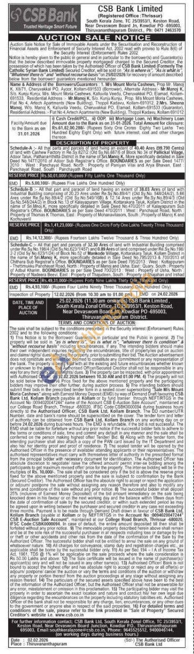 All that part and paracel of land having an extent of 38.03 Ares of land with Industrial Building comprising of 20.23 Ares under Re Sy No.89/4/1 (Old Sy No. 548/240/2), 5.66 Ares under Re Sy No. 89/4/2 (Old Sy. No: 549/168) & 12. 14 Ares under Re Sy. No. 89/4/3 (Old) Sy. No 548/244/2) in Block No. 13 of Kalayapuram Willage, Kottarakara Tauk, Kollam District in the name of Sin Alfino K, more specifically detailed in Sale Dese No 470/2011 of Kalayapuram Sub Registrar's Office. BOUNDARIES as as per Sale Deed 470/2011: West: Panchayat Road, North Property of Thomas K Thomas, East: Property of Mohanavilasom, South Property of Manoj K and Kochuveetil