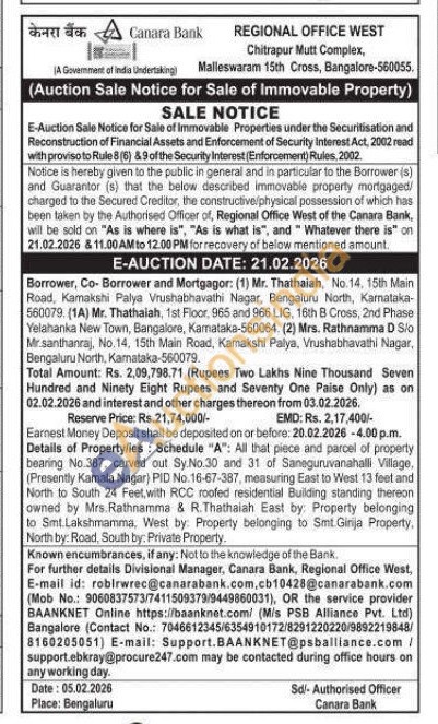 Details of Property/ies: Schedule "A": All that piece and parcel of property bearing No.387, carved out Sy No.30 and 31 of Saneguruvanahalli Village, (Presently Kamala Nagar) PID No. 16-67-387, measuring East to West 13 feet and North to South 24 Feet, with RCC roofed residential Building standing thereon owned by Mrs.Rathnamma & R. Thathaiah East by: Property belonging to Smt. Lakshmamma, West by: Property belonging to Smt.Girija Property. North by: Road, South by: Private Property.