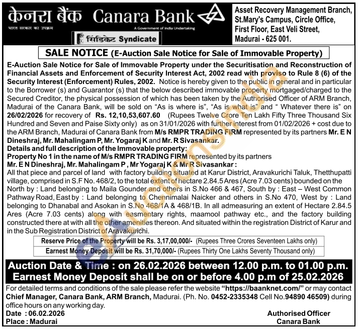 All that piece and parcel of land with factory building situated at Karur District, Aravakurichi Taluk, Thetthupatti village, comprised in S.F No. 468/2, to the total extent of hectare 2.84.5 Ares (Acre 7.03 cents) bounded on the North by: Land belonging to Maila Gounder and others in S.No 466 & 467, South by: East - West Common Pathway Road, East by: Land belonging to Chennimalai Naicker and others in S.No 470, West by: Land belonging to Dhanabal and Asokan in S.No 468/1A & 468/18. In all admeasuring an extent of Hectare 2.84.5 Ares (Acre 7.03 cents) along with easmentary rights, maamool pathway etc., and the factory building constructed there at with all the other amenities thereon. And situated within the registration District of Karur and in the Sub Registration District of Aravakurichi.