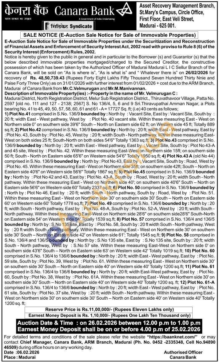 Description of Immovable Property(ies):- Property in the name of Mr. Velmurugan C: Madurai District, North Registration District, Melur Sub Registration District., Thiruvathavoor Village, Patta No. 2597 [old no. 111 and 127-2138; 2567] S. No 136/4, 5, 6 and 9 Sri. Thiravupathai Amman Nagar, a Plots bearing No. 41 to 45, 49, 50, 57, 58, 60, 61 and 61-A-17727 Sq. ft; (i.e) 40 cents as follows: 1) Plot No.41 comprised in S.No. 136/9 bounded by: North by: Vacant Site, East by: Vacant Site, South by: 20 ft; width East - West pathway, West by Plot No. 40 vacant site. Within these measuring East-West on Northern side 0" on southern side 39'6" South - North on Eastern side 62 ft; on Western side 45 ft; Totally 889 sq.ft; 2) Plot No.42 comprised in S.No. 136/9 bounded by: North by: 20 ft; width East-West pathway, East by Plot No. 43, South by: Plot No. 45, West by: 20 ft; width South-North pathway. Within these measuring East-West on both sides 25 ft; South-North on both sides 54'6" Totally 1363 sq.ft; 3) Plot No.43 comprised in S.No. 136/9 bounded by: North by: 20 ft; width East-West pathway, East by: Vacant Site, South by: Plot No 43-A and 45 site, West by: Plot No. 42. Within these measuring East-West on Northern side 15ft; on southern side 50 ft; South - North on Eastern side 65'6" on Western side 54'6" Totally 1950 sq.ft; 4) Plot No.43 A (old No 44) comprised in S.No. 136/9 bounded by: North by: Plot No 43, East by: Vacant Site, South by: Road, West by Plot No. 45. Within these measuring East-West on Northern side 35ft; on southern side 42ft; South-North on Eastern side 40'6" on Western side 56'6" Totally 1867 sq.ft; 5) Plot No.45 comprised in S.No. 136/9 bounded by: North by: Plot No 42 and 43, East by: Plot No. 43-A, South by Road, West by: 20 ft; width South - North pathway. Within these measuring East-West on Northern side 40'; on southern side 40'6" South - North on Eastern side 56'6" on Western side 60' Totally 2337 sq.ft; 6) Plot No. 50 comprised in S.No. 136/9 bounded by : North by: Plot No 46, East by: 20 ft; width South - North pathway, South by: Road, West by: Plot No. 51. Within these measuring East-West on Northern side 30' on southern side 30' South - North on Eastern side 60' on Western side 60' Totally 1778 sq.ft; 7) Plot No. 49 comprised in S.No. 136/6 bounded by: North by: 20 ft; width South - North pathway, East by: Plot No. 48-A, South by: Plot No. 52-A, West by: 20 ft; width South -North pathway. Within these measuring East-West on Northern side 28'6" on southern side28'6" South-North on Eastern side 54' on Western side 54' Totally 1539 sq.ft; 8) Plot No. 57 comprised in S.No. 136/4 and 136/5 bounded by: North by: S.No 135 site, East by: Plot No. 58, South by: 20 ft width South - North pathway, West by: 20 ft width South - North pathway. Within these measuring East-West on Northern side 30' on southern side 30' South - North on Eastern side 42' on Western side 61'; Totally 1545 sq.ft; 9) Plot No. 58 comprised in S.No. 136/4 and 136/5 bounded by: North by: S.No 135 site, East by: S.No 135 site, South by: 20 ft; width South North pathway, West by S.No 57 site. Within these measuring East-West on Northern side 0' on southern side 43'6" South-North on Eastern side 63' on Western side 42' Totally 1019 sq.ft; 10) Plot No. 60 comprised in S.No. 136/4 to 136/6 bounded by: North by: 20 ft; width East-West pathway, East by: Plot No. 59 site, South by: Plot No. 39, West by: Plot No. 61. Within these measuring East-West on Northern side 30' on southern side 30' South - North on Eastern side 40' on Western side 40' Totally 1200 sq.ft; 11) Plot No. 61 comprised in S.No. 136/4 to 136/6 bounded by: North by: 20 ft; width East-West pathway, East by: Plot No. 60, South by: Plot No. 38, West by: Plot No. 61A. Within these measuring East-West on Northern side 30' on southern side 30' South-North on Eastern side 40' on Western side 40' Totally 1200 sq. ft; 12) Plot No. 61-A comprised in S.No. 136/4 to 136/6 bounded by: North by: 20 ft; width East-West pathway, East by: Plot No. 61 site, South by: Plot No. 37 site, West by: 20 ft; width South - North pathway. Within these measuring East -West on Northern side 30' on southern side 30' South-North on Eastern side 40' on Western side 40' Totally 1200 sq. ft;