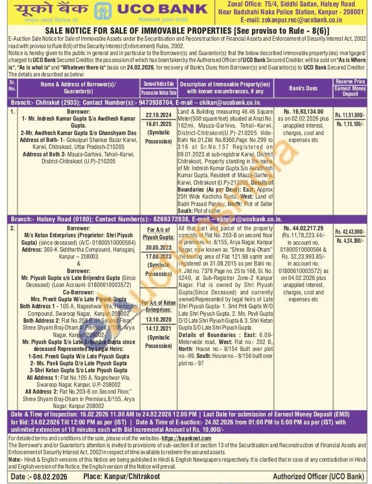 All that part and parcel of the property consists of Flat No. 203-B on second floor in premises no. 8/155, Arya Nagar, KanpurNagar, now known as "Shree Braj-Dham" measuring area of Flat 121.98 sqmtr and registered on 31.08.2015 as per Bahi no. 1, Jild no. 7378 Page no. 25 to 168, Sl. No. 5240, at Sub-Registrar Zone-2 Kanpur Nagar. Flat is owned by Shri Piyush Gupta (Since Deceased) and currently owned/Represented by legal heirs of Late Shri Piyush Gupta- 1. Smt Priti Gupta W/O Late Shri Piyush Gupta, 2. Ms. Pavli Gupta D/O Late Shri Piyush Gupta & 3. Shri Ketan Gupta S/O Late Shri Piyush Gupta.Details of Boundaries: East: 6.09-Meterwide road, West: Flat no. 202 В, North: House no. 8/154 Built over plot no,-99, South: House no. 8/156 built over plot no.-97