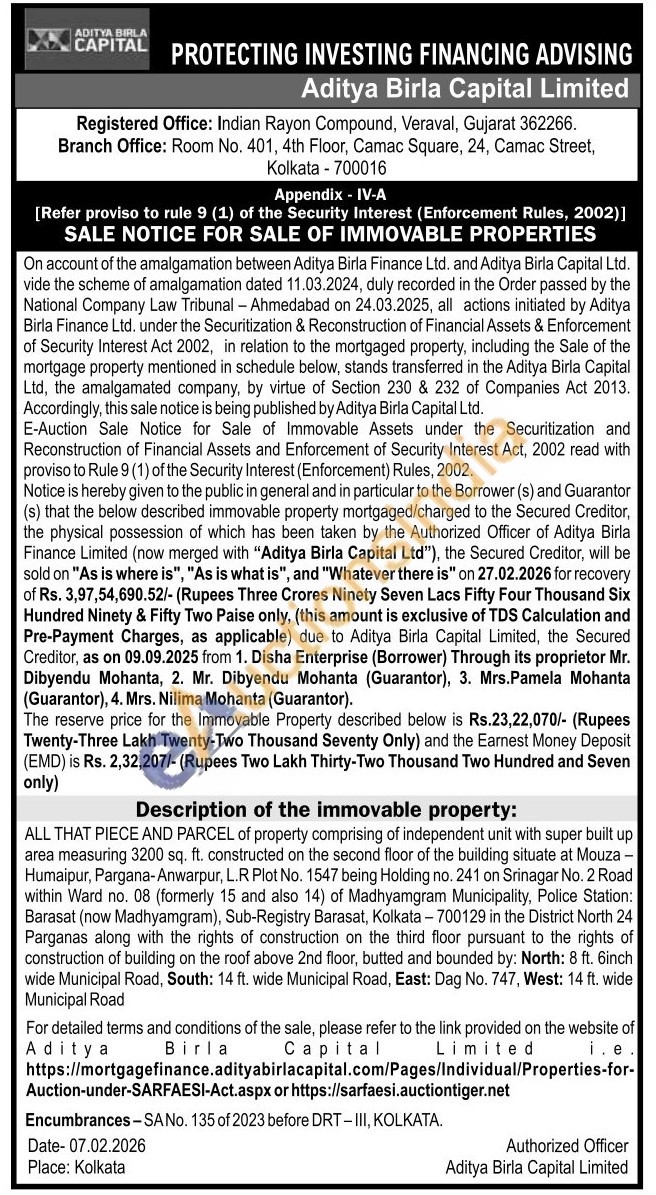 Description of the immovable property: ALL THAT PIECE AND PARCEL of property comprising of independent unit with super built up area measuring 3200 sq. ft. constructed on the second floor of the building situate at Mouza -Humaipur, Pargana-Anwarpur, L.R Plot No. 1547 being Holding no. 241 on Srinagar No. 2 Road within Ward no. 08 (formerly 15 and also 14) of Madhyamgram Municipality, Police Station: Barasat (now Madhyamgram), Sub-Registry Barasat, Kolkata -700129 in the District North 24 Parganas along with the rights of construction on the third floor pursuant to the rights of construction of building on the roof above 2nd floor, butted and bounded by: North: 8 ft. 6inch wide Municipal Road, South: 14 ft. wide Municipal Road, East: Dag No. 747, West: 14 ft. wide Municipal Road