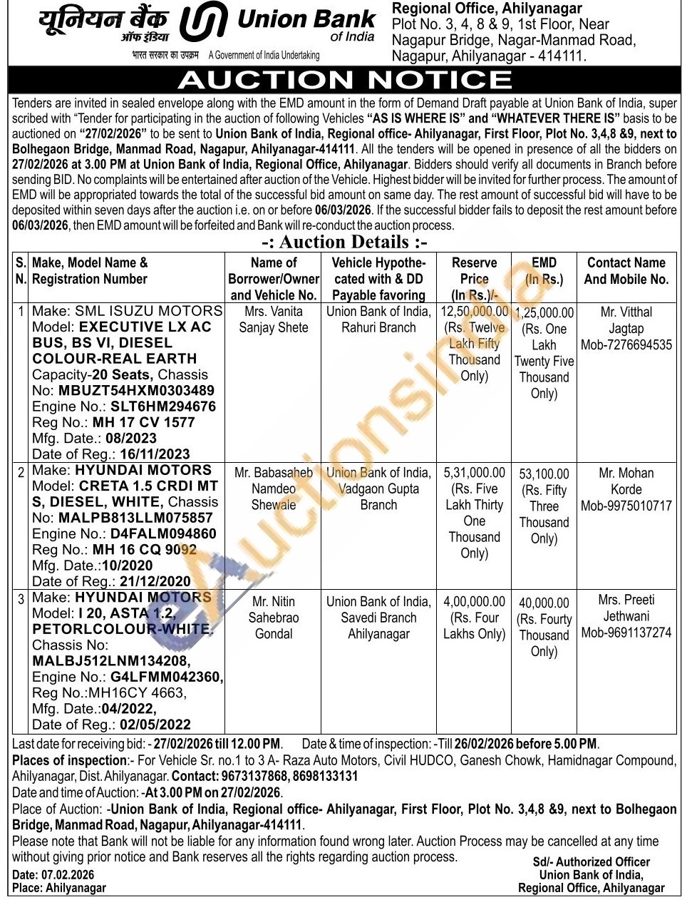 Make: HYUNDAI MOTORS Model: I 20, ASTA 1.2, PETORLCOLOUR-WHITE. Chassis No: MALBJ512LNM134208, Engine No.: G4LFMM042360, Reg No.:MH16CY 4663, Mfg. Date.:04/2022, Date of Reg.: 02/05/2022