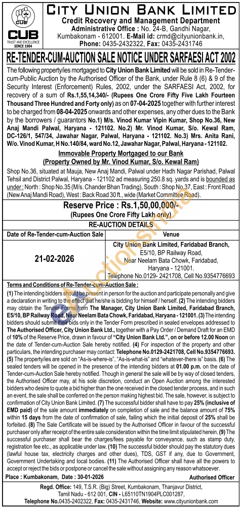 Shop No.36, situated at Mauja, New Anaj Mandi, Palwal under Hadh Nagar Parishad, Palwal Tehsil and District Palwal, Haryana - 121102 ad measuring 250.8 sq. yards and is bounded as under: North: Shop No.35 (M/s. Chander Bhan Trading), South: Shop No.37, East: Front Road (New Anaj Mandi Road), West: Back Road 30 ft., wide (Market Committee Road)