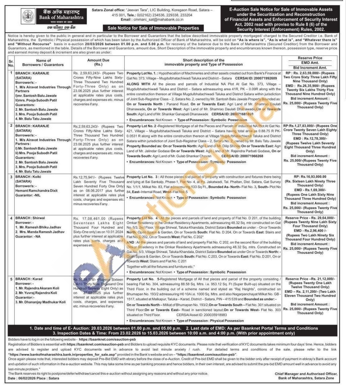Property Lot No. 2-Registered Mortgage of all the Pieces and Parcels of Industrial NA Plot At Gat No. 421, Village-Mugdulbhatachiwadi Taluka and District-Satara having total area as 0.88.75 R PK-0.0531 R along with the entire construction thereon at Village Mugdulbhatachiwadi Taluka and District Satara within jurisdiction of Joint Sub-Registrar Class-2, Satara No. 2, owned by Mr. Balu Tatu Jawale Property Bounded as: On or Towards North: Agri Land of Mr. Dilip Shinde On or Towards East: Agri Land of Mr. Jalindar Godase On or Towards West: Agri Land of Mr. Rajendra Parbati Godase, On or Towards South: Agri Land of Mr. Gulab Shankar Chavan CERSAI ID: 200071966268 Encumbrances: Not Known Type of Possession: Symbolic Possession