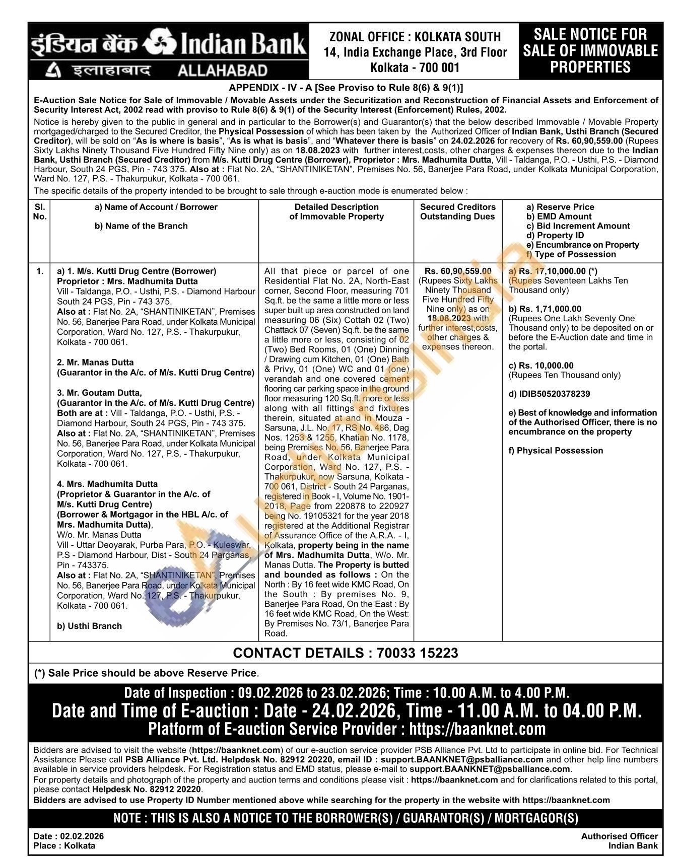 All that piece or parcel of one Residential Flat No. 2A, North-East corner, Second Floor, measuring 701 Sq ft. be the same a little more or less super built up area constructed on land measuring 06 (Six) Cottah 02 (Two) Chattack 07 (Seven) Sq.ft. be the same a little more or less, consisting of 02 (Two) Bed Rooms, 01 (One) Dinning /Drawing cum Kitchen, 01 (One) Bath & Privy, 01 (One) WC and 01 (one) verandah and one covered cement flooring car parking space in the ground floor measuring 120 Sq.ft. more or less along with all fittings and fixtures therein, situated at and in Mouza Sarsuna, J.L. No. 17, RS No. 486, Dag Nos. 1253 & 1255, Khatian No. 1178, being Premises No. 56, Banerjee Para Road, under Kolkata Municipal Corporation, Ward No. 127, P.S. Thakurpukur, now Sarsuna, Kolkata -700 061, District-South 24 Parganas, registered in Book-I, Volume No. 1901-2018, Page from 220878 to 220927 being No. 19105321 for the year 2018 registered at the Additional Registrar of Assurance Office of the A.R.A. -I, Kolkata, property being in the name of Mrs. Madhumita Dutta, W/o. Mr. Manas Dutta. The Property is butted and bounded as follows: On the North: By 16 feet wide KMC Road, On the South By premises No. 9. Banerjee Para Road, On the East: By 16 feet wide KMC Road, On the West: By Premises No. 73/1, Banerjee Para Road.