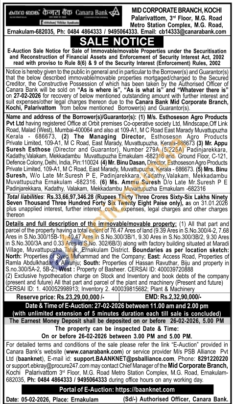 Details and full description of the immovable/movable property: (1) All that part and parcel of the property having a total extent of 76.47 Ares of land (9.39 Ares in S.No.300/4-2, 7.68 Ares in S.No.300/15B-11, 40.47 Ares in S.No.300/3B/1, 9.30 Ares in S.No.300/38/2, 9.30 Ares in S.No.300/3A and 0.33 Ares in S.No. 302/6B/3) along with factory building situated at Maradi Village, Muvattupuzha Taluk, Ernakulam District. Boundaries as per location sketch: North: Properties of Syed Muhammad and the Company: East: Access Road, Properties of Ramla Abdulkhadar & Alikunju; South: Properties of Hassan Ravuthar, Biju and property in S.no.300/5A-2, 58-2.; West: Property of Basheer. CERSAI ID: 400039720888 (2) Exclusive hypothecation charge on Stock and Inventory and book debts of the company (present and future) All that part and parcel of the plant and machinery (Present and future)