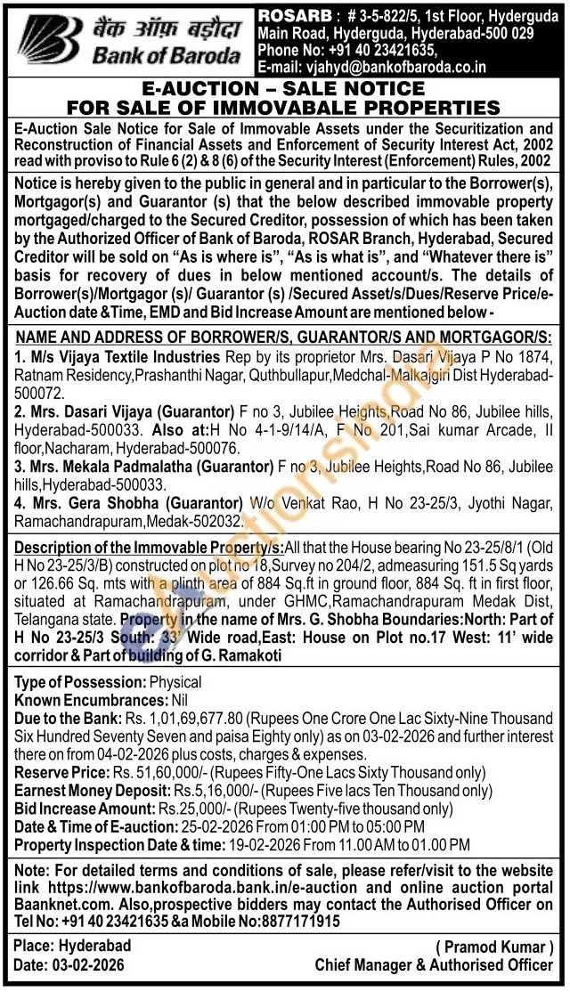 Authorised Officer on Telephone No: +91 40 23421635 /Mobile No : 8877171915