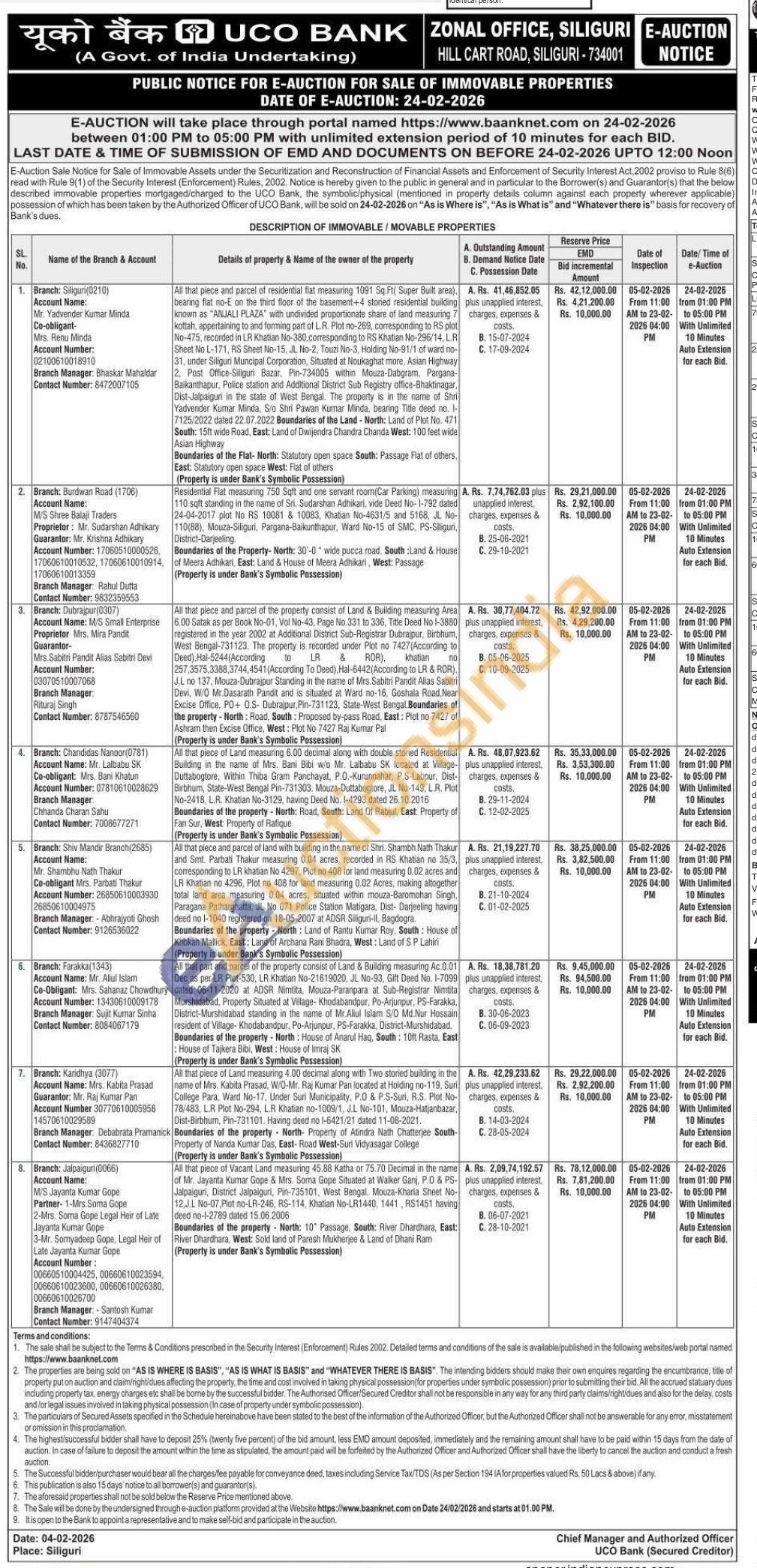 All that piece of Vacant Land measuring 45.88 Katha or 75.70 Decimal in the name of Mr. Jayanta Kumar Gope & Mrs. Soma Gope Situated at Walker Ganj, P.O & PS-Jalpaiguri, District Jalpaiguri, Pin-735101, West Bengal. Mouza-Kharia Sheet No-12,J.L No-07, Plot no-LR-246, RS-114, Khatian No-LR1440, 1441, RS1451 having deed no-1-2789 dated 15.06.2006 Boundaries of the property North: 10" Passage, South: River Dhardhara, East: River Dhardhara, West: Sold land of Paresh Mukherjee & Land of Dhani Ram (Property is under Bank's Symbolic Possession)