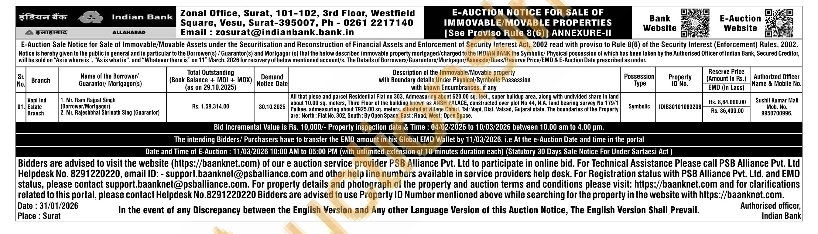 All that piece and parcel Residential Flat ne 303, Admeasuring about 620.00 sq. feet., super buildup area, along with undivided share in land about 10.00 sq. meters, Third Floor of the building known as ANSH PALACE, constructed over plot No 44, N.A. land bearing survey No 179/1 Paikee, admeasuring about 7925.00 sq. meters, situated at village Chhiri, Tal: Vapi, Dist. Valsad, Gujarat state. The boundaries of the Property are: North: Flat No. 302, South: By Open Space, East: Road, West: Open Space