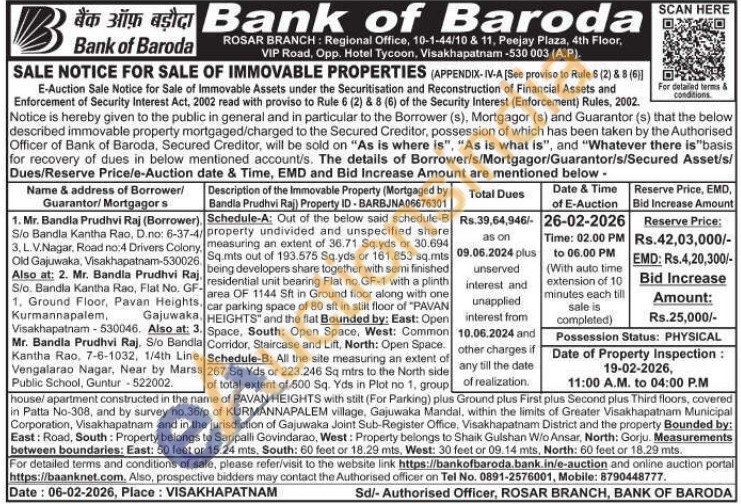 Schedule-B: All the site measuring an extent of 267 Sq Yds or 223.246 Sq mtrs to the North side of total extent of 500 Sq. Yds in Plot no 1, group house/ apartment constructed in the name of PAVAN HEIGHTS with stilt (For Parking) plus Ground plus First plus Second plus Third floors, covered in Patta No-308, and by survey no.36/p of KURMANNAPALEM village, Gajuwaka Mandal, within the limits of Greater Visakhapatnam Municipal Corporation, Visakhapatnam and in the jurisdiction of Gajuwaka Joint Sub-Register Office, Visakhapatnam District and the property Bounded by: East: Road, South: Property belongs to Saripalli Govindarao, West: Property belongs to Shaik Gulshan W/o Ansar, North: Gorju. Measurements between boundaries: East: 50 feet or 15.24 mts, South: 60 feet or 18.29 mts, West: 30 feet or 09.14 mts, North: 60 feet or 18.29 mts