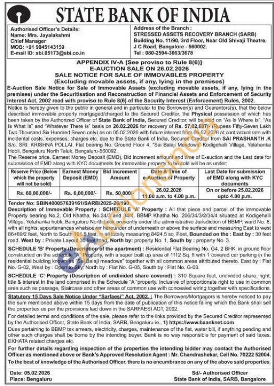 Authorised Officer's Details: Name: Mrs. Jayalakshmi Chief Manager Mobile no : +91 9945143159 / Bangalore Telephone No : 08025943663 / 3678