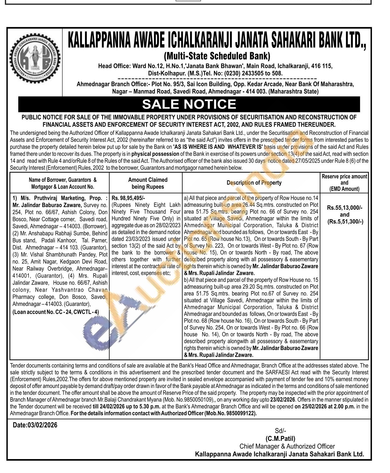 a) All that piece and parcel of the property of Row House no. 14 admeasuring built-up area 26.44 Sq.mtrs. constructed on Plot area 51.75 Sq.mtrs. bearing Plot no. 66 of Survey no. 254 situated at Village Savedi, Ahmednagar within the limits of Ahmednagar Municipal Corporation, Taluka & District Ahmednagar and bounded as follows, On or towards East - By Plot no. 65 (Row house No.13), On or towards South - By Part of Survey No. 223, On or towards West - By Plot no. 67 (Row house No. 15), On or towards North By road, The above described property along with all possessory & easementary rights therein which is owned by Mr. Jalindar Baburao Zaware & Mrs. Rupali Jalindar Zaware. b) All that piece and parcel of the property of Row House no. 15 admeasuring built-up area 29.20 Sq.mtrs. constructed on Plot area 51.75 Sq.mtrs. bearing Plot no.67 of Survey no. 254 situated at Village Savedi, Ahmednagar within the limits of Ahmednagar Municipal Corporation, Taluka & District Ahmednagar and bounded as follows, On or towards East - By Plot no. 68 (Row house No. 16), On or towards South - By Part of Survey No. 254, On or towards West - By Plot no. 66 (Row house No. 14), On or towards North By road, The above described property alongwith all possessory & easementary rights therein which is owned by Mr. Jalindar Baburao Zaware & Mrs. Rupali Jalindar Zaware.
