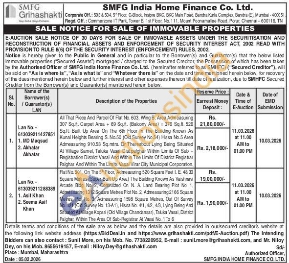 All That Piece And Parcel Of Flat No. 603, Wing B, Area Admeasuring 307 Sq.ft. Carpet Area + 69 Sq.ft. (Balcony Area) = 376 Sq.ft. 526 Sq.ft. Built Up Area On The 6th Floor In The Building Known As Kunal Heights Bearing S. No.50 (Old Survey No.54) Hissa No.5 Area Admeasuring 910.53 Sq.mtrs. Or Thereabout Lying Being Situated At Village Samel, Taluka Vasai Dist palghar Within Limits Of Sub Registration District Vasai And Within The Limits Of District Registrar Palghar And Within The Limits Vasai Virar City Municipal Corporation
