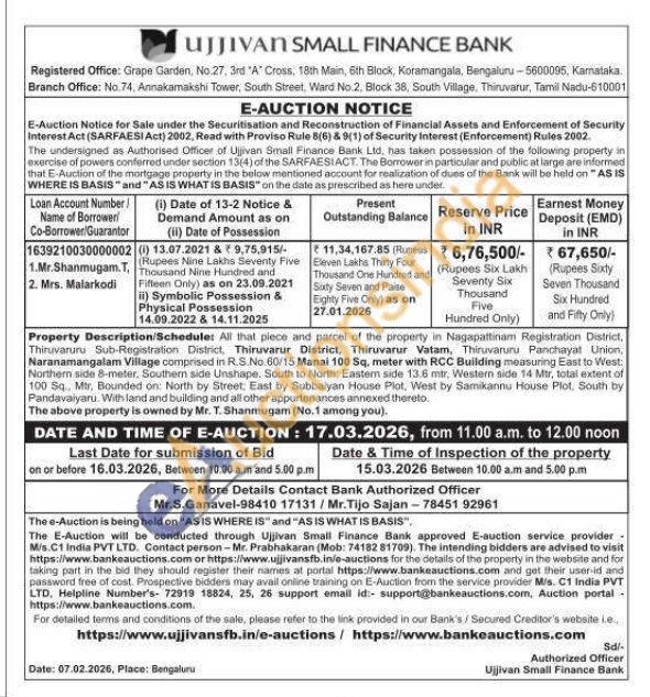 Property Description/Schedule: All that piece and parcel of the property in Nagapattinam Registration District, Thiruvaruru Sub-Registration District. Thiruvarur District, Thiruvarur Vatam, Thiruvaruru Panchayat Union, Naranamangalam Village comprised in R.S.No. 60/15 Manal 100 Sq, meter with RCC Building measuring East to West: Northern side 8-meter, Southem side Unshape, South to North: Eastem side 13.6 mtr, Western side 14 Mtr, total extent of 100 Sq., Mir, Bounded on: North by Street: East by Subbalyan House Plot, West by Samikannu House Plot. South by Pandavaiyaru. With land and building and all other appurtenances annexed thereto,