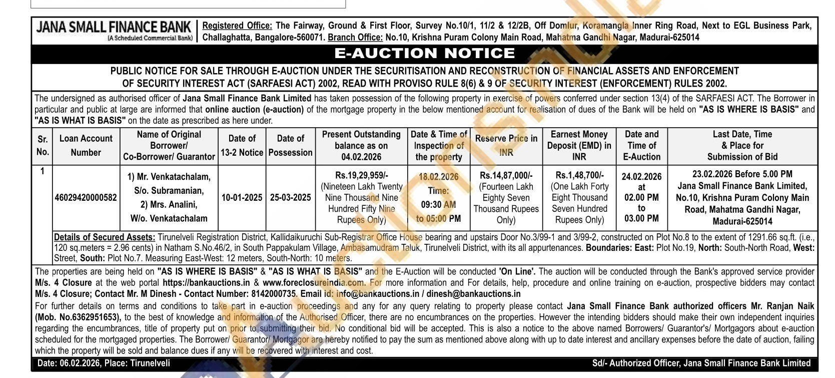 Details of Secured Assets: Tirunelveli Registration District, Kallidaikuruchi Sub-Registrar Office House bearing and upstairs Door No.3/99-1 and 3/99-2, constructed on Plot No.8 to the extent of 1291.66 sq.ft. (i.e.. 120 sq.meters = 2.96 cents) in Natham S.No.46/2, in South Pappakulam Village, Ambasamudram Taluk, Tirunelveli District, with its all appurtenances. Boundaries: East: Plot No. 19, North: South-North Road, West: Street, South: Plot No.7. Measuring East-West: 12 meters, South-North: 10 meters.