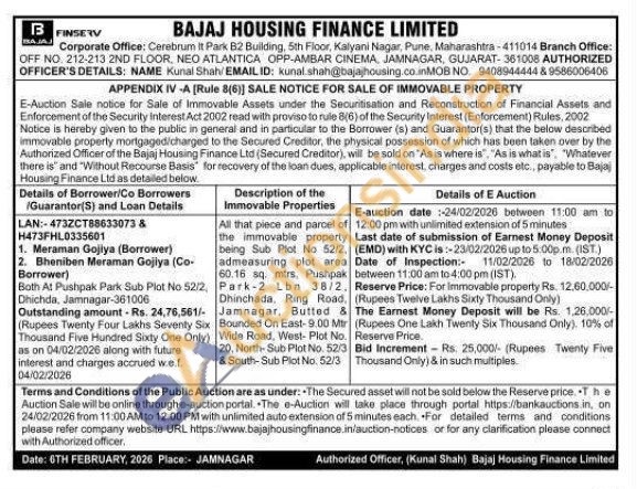 All that piece and parcel of the immovable property being Sub Plot No 52/2, admeasuring plot area 60.16 sq. mtrs, Pushpak Park-2 Lbn 38/2. Dhinchada. Ring Road, Jamnagar, Butted & Bounded On East-9.00 Mtr Wide Road, West-Plot No. 20, North-Sub Plot No. 52/3 & South-Sub Plot No. 52/3