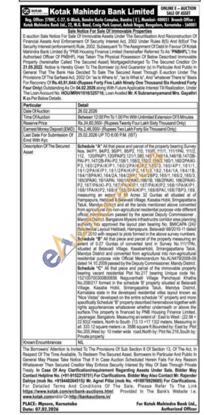 Schedule "A" All that piece and parcel of the property bearing Survey Asset Nos 94/P1, 94/P2, 95/P1, 96/P2, 110, 110, 1111, 111/19 1112 112, 120/PA/P1,120/PAIP2, 121/1,580,145/1.146/14 146/18.147/28-PAL-P1, 147/28-PAI-P2.158/1,158/2, 159/2,1583, 160/1,160(2PAIK) P3,160/2PAIΚΙΡ 1,160/2ΡΑΙKIP2, 160/3,160/4P1,161/1, 161:2PAIKIP1, 161/2PAIKIP2,16113,182,164/1A, 164/13, 164/18ΡΑΙΚΙ, 164/24, 164/28P1,164/28P2,165/1,165/2,165/3 165/3РАЮ 16/1ΑΡΑΙ, 106/1ΑΡΑΙΚΙ, 166/16, 1662ΡΑΚΙ, 166/2ΡΑΙΚΙ P2, 167/PAIKI-P3,167/PAIKIP1, 167/PAIKIP2,168/1PAIKIP1, 168/1PAIKIP2, 168/4,168/SPAIKIP1, 166/6PAL 168/7BP3,169, measoning an extent of 68 Acres 32 Guntas al situsted an of Hampapura, Hebbedi & Belavadi Village, Kasabe Hobil, Singepatena Taluk, Mandya Dedrict and all the lands mentioned above corverted from agricultural into non-agricultural residential purpose vide different official memorandum passed by the special Deputy Commissioner Mandya District Bangalore Mysore infrastructre comdor area planning authority has approved the leyout plan bearing No. BMICAPA (24) Residental Layout Hebbad, Hampapила. Вена 66/2010-11 dined 03.07.2010 with respect to plats formed in the above survey numbers Schedule "B" Al that piece and parcel of the property measuring an endent of 0-27 Guntas of converted land in Survey No.111/PAL shuated at Belavad Village, KasabaHobil Srirangapattana Taluk Mandya District and converted from agricultural to non-agricultural residente purpose vide Official Memorandum No ALNA72008-09 dated 14. 10.2009 passed by the Deputy Commissioner, Mandy District Schedule "C" All that prece and parcel of the immovable property bearing vacant residential Plot No 217 bearing Unique code No 152100700300800656 Naguvanhali Vilage Panchayal Khatha No 208/217 tormed in the schedule B' property situated at Belavadi Village, Kasaba Hobil Srirangapatna Taluk, Mandya Dict Kamuka state in the developed residenttal villas tayout known as Nice Vistas developed on the entire schedule "A" property and more specifically Schedule "B" property described hereinabove together with nights appurtenances whatsoever whether undemsath or above the surface. This property is financed by PNS Housing Finance Limited. Jayanagar, Bangalore. Measuring an extent of East to West (22.58 22.0032 meters, North to South (13.13 +17.1312 meters. Measuring in a: 333.12 square meterse 3586 square ft Bounded by: East by Plat No. 205. Weat by: 10 meter wide road.North by Plot No 216, South by Private property