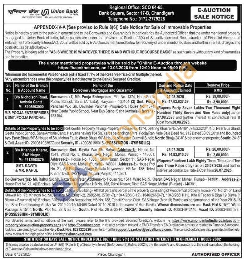 Land and Building-All that part and parcel of the property consisting of Residential property House Plot No. 21 on Land Khewat No. 93, Khatoni No. 96, Khasra No. 268(1-2), 269(2-0), 270(1-7), 1044/266(0-12), 1046/266(0-7), 1048/268(1-11), Kite 6 Tadadi 6 Biga 19 Biswa (1) Biswa 4 Biswansi) Ajit Enclave, Village Badala Nayasehar, HB No. 188, Tehsil Kharar, Distt. SAS Nagar (Mohali) Punjab as per jamabandi of the Year 2015-16 and Sale Deed bearing Vasika No. 2019-20/15/1/8406 Dated 07.10.2019 in the name of Mrs. Kavita. Whose dimensions are as:- East: Flat & 15'6"; West: Passage & 15'6"; North: Plot No. 22 & 35 Ft.; South: Plot No. 20 & 35 Ft. CERSAI Security Interest ID: 400034942140; Asset ID: 200034883623-(POSSESSION-SYMBOLIC)