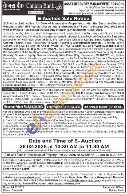 Property in the name of Saraswathi. All that part and parcel on premises bearing No.1-11-256/K/2 with PTI No. 1180101520.admeasuring 400.00 square yard, buit up area 1500.00 square feet with A.C.C. Sheets, Bhagvanthapur. Near Old Airport, Begumpet Paigah(V), Balanagar(M). Medchal-Malkajgiri(D), Telengana-500 016 and bounded by: North House No. 1-11-256/K/3, South House No.1-11-256/K/1, East: 30' wide road, West: SBI Colony