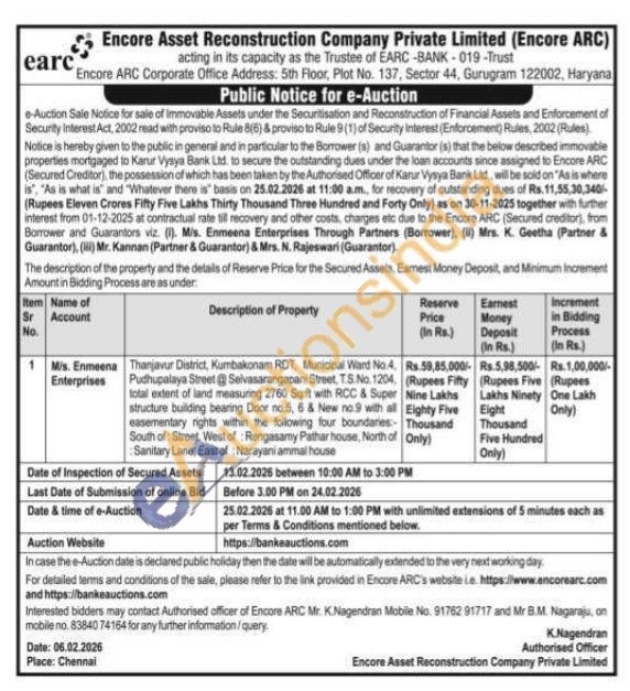 Thanjavur District, Kumbakonam RDT, Municipal Ward No.4, Pudhupalaya Street Selvasarangapani Street, T.S.No. 1204. total extent of land measuring 2760 Sq.ft with RCC & Super structure building bearing Door no.5, 6 & New no.9 with all easementary rights within the following four boundares South of: Street, West of: Rengasamy Pathar house, North of Sanitary Lane, East of: Narayani ammal house