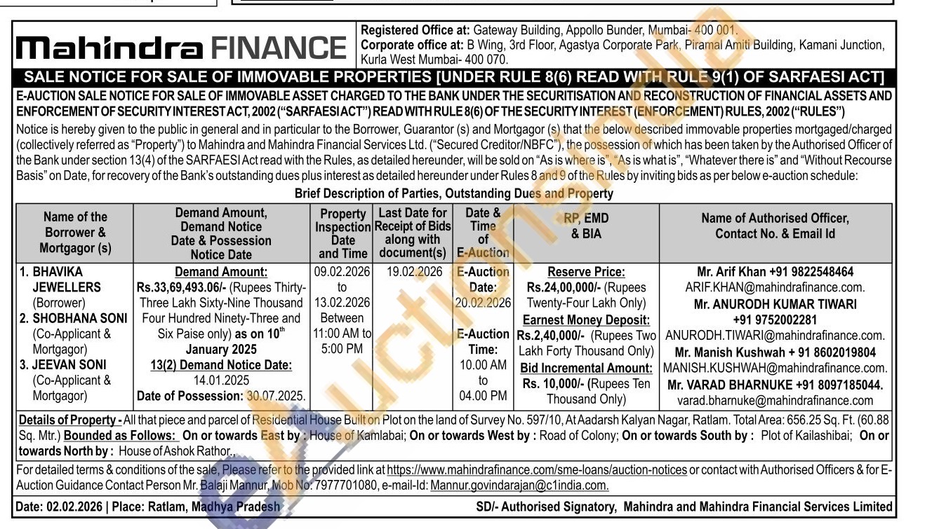 Details of Property - All that piece and parcel of Residential House Built on Plot on the land of Survey No. 597/10, At Aadarsh Kalyan Nagar, Ratlam. Total Area: 656.25 Sq. Ft. (60.88) Sq. Mtr.) Bounded as Follows: On or towards East by: House of Kamlabai; On or towards West by: Road of Colony; On or towards South by: Plot of Kailashibai; On or towards North by: House of Ashok Rathor.,