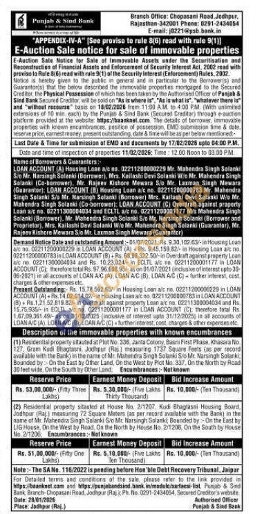 Residential property sitauted at House No. 2/1207. Kudi Bhagtasni Housing Board Jodhpur (Raj.) measuring 72 Square Meters jas per record available with the Bank) in the name of Mr. Mahendra Singh Solanki S/o Mr. Narsingh Solanki, Bounded by-On the East by LIG House, On the West by Road. On the North by House No. 2/1208, On the South by House Να 2/1206. Εncumbrances: Not known