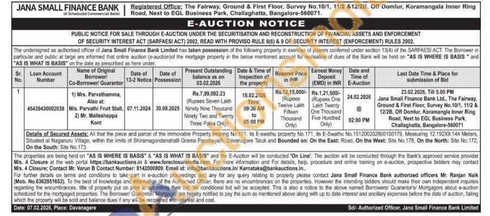 Details of Secured Assets: All that the piece and parcel of the immovable Property bearing No. 171, its E-swathu property No. 171, its E-Swathu No. 151200202800100179, Measuring 12.192X9 144 Meters, Situated at Naganuru Village, within the limits of Shiramagondanahalli Grama Panchayath, Davanagere Taluk and Bounded on: On the East: Road, On the West: Site No. 178, On the North: Site No. 172, On the South: Site No.173