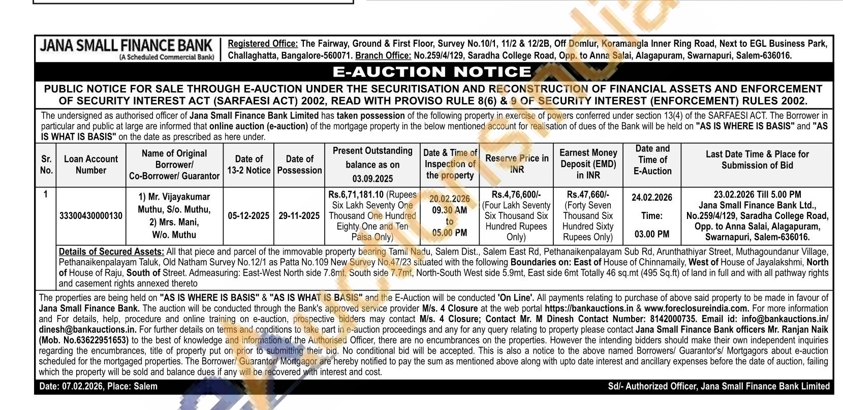 Details of Secured Assets: All that piece and parcel of the immovable property bearing Tamil Nadu, Salem Dist., Salem East Rd, Pethanaikenpalayam Sub Rd, Arunthathiyar Street, Muthagoundanur Village, Pethanaikenpalayam Taluk, Old Natham Survey No. 12/1 as Patta No. 109 New Survey No. 47/23 situated with the following Boundaries on: East of House of Chinnamaily, West of House of Jayalakshmi, North of House of Raju, South of Street. Admeasuring: East-West North side 7.8mt, South side 7.7mt, North-South West side 5.9mt, East side 6mt Totally 46 sq.mt (495 Sq.ft) of land in full and with all pathway rights and casement rights annexed thereto