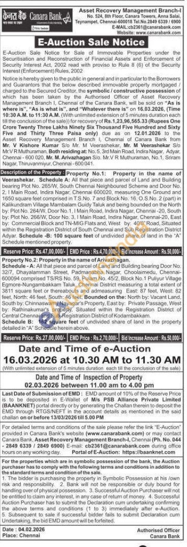 Property in the name of Veerashekar. Schedule A: All that piece and parcel of Land and Building bearing Plot No. 265/W, South Chennai Neighboured Scheme and Door No. 2.1 Main Road, Indira Nagar, Chennai 600020, measuring One Ground and 1650 square feet comprised in TS.No. 7 and Block No. 16, O.S.No. 2 (part) in Kalikundram Village Mambalam Guidy Taluk and being bounded on the North by: Plot No. 264/W, Door No. 1.1 Main Road, Indira Nagar, Chennai-20, South by: Plot No. 266/W, Door No. 3, 1 Main Road, Indira Nagar, Chennai-20, East by: Commercial Block and TN-MIG Flats and, West by: 40'0" Road, Situated within the Registration District of South Chennai and Sub Registration District Adyar. Schedule -B: 100 square feet of undivided share of land in the "A" Schedule mentioned property.