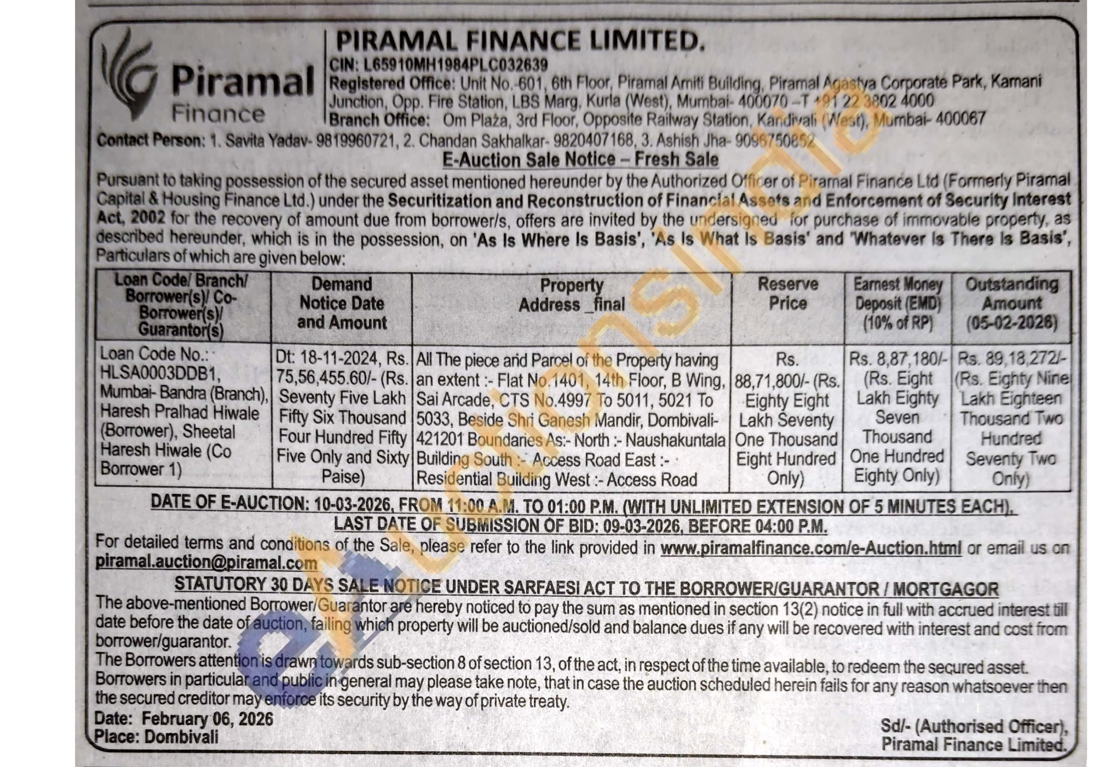 All The piece arid Parcel of the Property having an extent :- Flat No.1401, 14th Floor, B Wing, Sai Arcade, CTS No.4997 Το 5011, 5021 Το 5033, Beside Shri Ganesh Mandir, Dombivali-421201 Boundaries As:- North:- Naushakuntala Building South: Access Road East:-Residential Building West :- Access Road