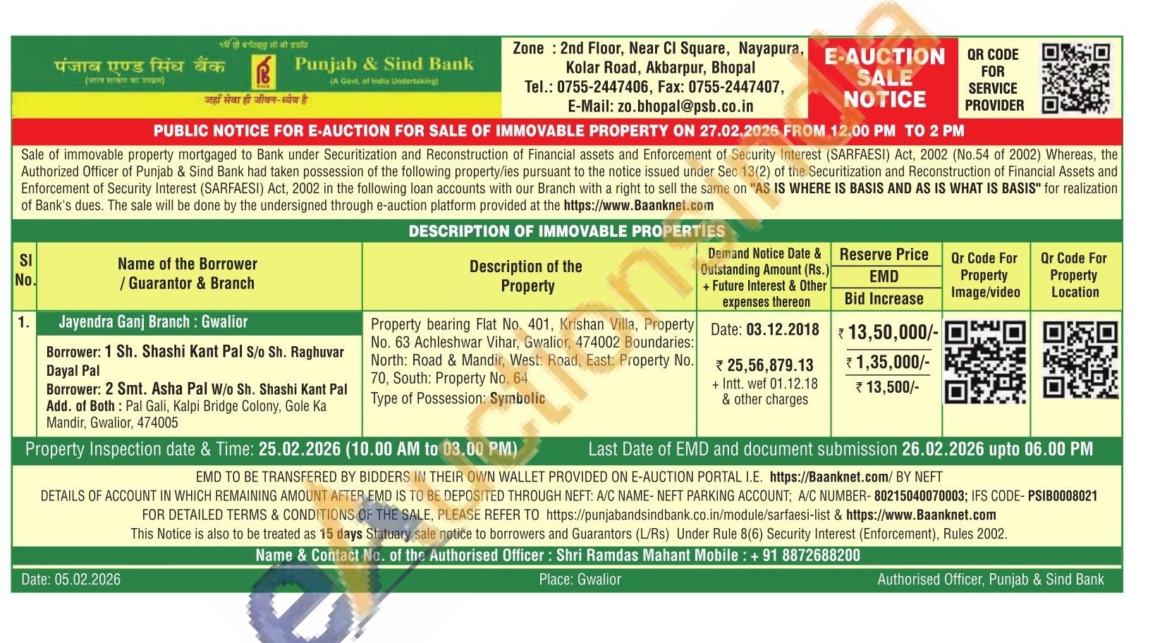 Property bearing Flat No. 401, Krishan Villa, Property No. 63 Achleshwar Vihar, Gwalior, 474002 Boundaries: North: Road & Mandir, West: Road, East: Property No. 70, South: Property No. 64
