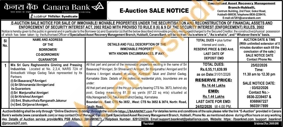 All that part and parcel of the immovable properties existing in the name of Sri Basavaraj P Annigeri, Sri Shivanand I Annigeri, Sri Manjunatha | Annigeri and Sri Krishna | Annigeri situated at village: Kurthkoti, Taluk and District Gadag Kamataka State. Details of the individual residential plots, boundaries are as under All that part and parcel of the House property bearing CTS No. 3673, behind city post, Gadag measuring 81.00 sq yards (67.22 sq mts) situated at Killa, Naragaradi Oni. Taluk and District Gadag, Karnataka. Boundaries: East: CTS No 3652, West: CTS No 3652 & 3674, North: Road, South: Road.