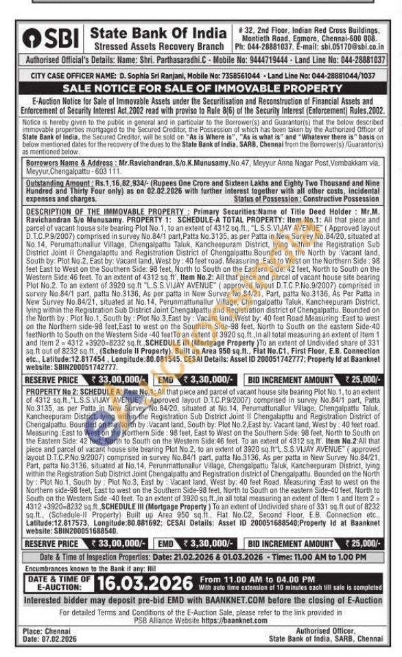 Ravichandran S/o Munusamy. PROPERTY 1: SCHEDULE-A TOTAL PROPERTY: Item No.1: All that piece and parcel of vacant house site bearing Plot No.1, to an extent of 4312 sq.ft., "L.S.S.VIJAY AVENUE" (Approved layout D.T.C.P.9/2007) comprised in survey No.84/1 part, Patta No.3135, as per Patta in New Survey No. 84/20, situated at No.14, Perumattunallur Village, Chengalpattu Taluk, Kancheepuram District, lying within the Registration Sub District Joint II Chengalapttu and Registration District of Chengalpattu Bounded on the North by Vacant land, South by: Plot No.2. East by: Vacant land, West by: 40 feet road. Measuring: East to West on the Northern Side: 98 feet East to West on the Southern Side: 98 feet, North to South on the Eastern Side: 42 feet, North to South on the Western Side:46 feet. To an extent of 4312 sq.ft', Item No.2: All that piece and parcel of vacant house site bearing Plot No.2. To an extent of 3920 sq.ft "L.S.S. VIJAY AVENUE" (approved layout D.T.C.P.No.9/2007) comprised in survey No.84/1 part, patta No.3136, As per patta in New Survey No.84/21, Part, patta No.3136, As Per Patta in New Survey No. 84/21, situated at No.14, Perunmattunallur Village, Chengalpattu Taluk, Kancheepuram District, lying within the Registration Sub District Joint Chengalpattu and Registration district of Chengalpattu. Bounded on the North by: Plot No. 1, South by: Plot No.3, East by: Vacant land, West by: 40 feet Road. Measuring: East to west on the Northern side-98 feet, East to west on the Southern Side-98 feet, North to South on the eastern Side-40 feetNorth to South on the Western Side 40 feetTo an extent of 3920 sq.ft. In all total measuring an extent of Item 1 and Item 2 4312 +3920-8232 sq.ft. SCHEDULE III (Mortgage Property) To an extent of Undivided share of 331 sq.ft out of 8232 sq.ft.. (Schedule II Property). Built up Area 950 sq.ft., Flat No.C1, First Floor, E.B. Connection etc., Latitude: 12.817454, Longitude:80.081545. CESAI Details: Asset ID 200051742777: Property Id at Baanknet website: SBIN200051742777.