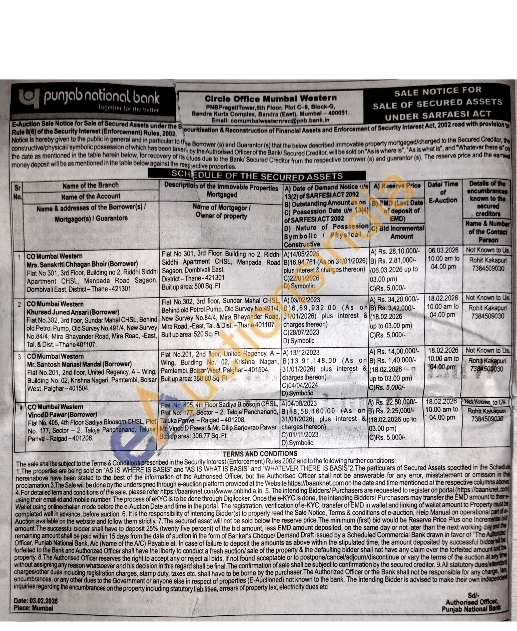 Flat No. 405, 4th Floor Sadiya Blossom CHSL Plot No. 177. Sector-2, Taloja Panchanand,Taluka Panvel-Raigad-401208. Mr. Vinod D Pawar & Mr. Dilip Sarjevrao Pawar Buit up area: 306.77 Sq. Ft