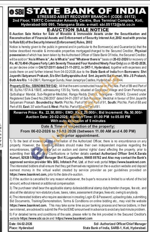 Property ID No.: SBIN39667891342: All that the semi constructed house on Plot Nos. Part of 89 and Part of 90, Sy.No. 157/A & 158/E, admeasuring 135 Sq. Yards, situated at Gagilapur Village and Gram Panchayat, Qutbullapur Mandal, Sub-Registrar-Medchal, Ranga Reddy District, Telangana 500043, Covered under Registered Sale Deed No.256/2007 dated 04-01-2007 of Sub Registrar, Medchal in favour of Shri Jayanthi Satyamani Prakash. Bounded by: North: Plot No. Part of 90 and Part of 91, South: Plot No. Part of 88 and Part of 89, East: 30 wide Road & West: Plot No. Partof 80 and Partof81.