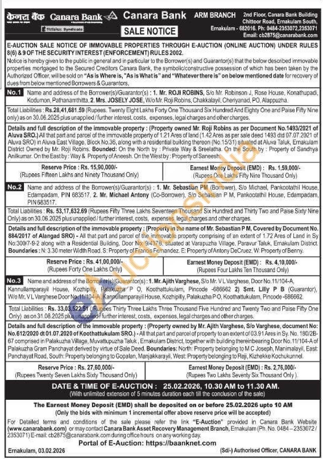 Details and full description of the immovable property: (Property owned by Mr. Ajith Varghese, Sio Varghese, document No: No.612/2020 dt 01.07.2020 of Koothattukulam SRO.) -All that part and parcel of property to an extent of 03.91 Ares in Sy. No. 180/28-67 comprised in Palakuzha Village, Muvattupuzha Taluk, Ernakulam District, together with building thereinbearing Door No. 11/104-A of Palakuzha Gram Panchayat derived by virtue of Sale Deed. Boundaries: North: Property belonging to MC Joseph, Manimalayil, East Panchayat Road, South: Property belonging to Gopalan, Manjakkarayil, West: Property belonging to Reji, Kizhekke Kochukunnel.