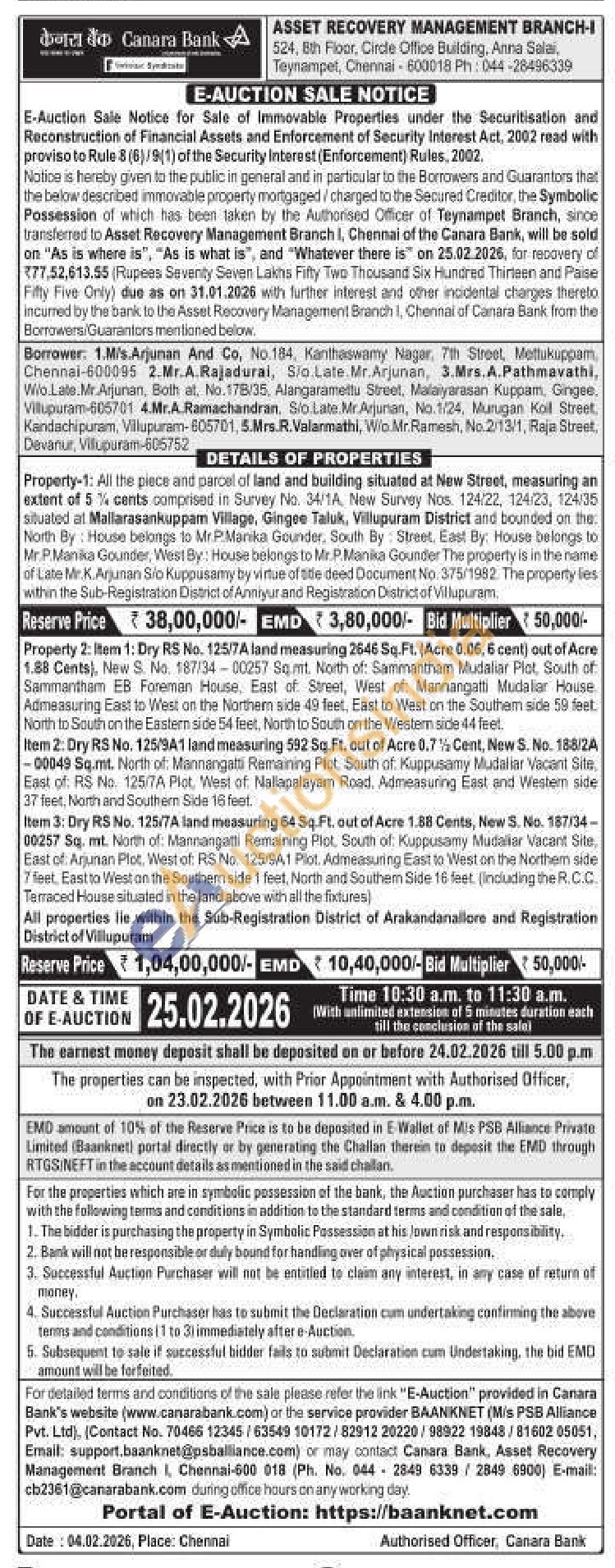 Property 2: Item 1: Dry RS No. 125/7A land measuring 2646 Sq. Ft. (Acre 0.06, 6 cent) out of Acre 1.88 Cents), New S. No. 187/34-00257 Sq.mt. North of: Sammantham Mudaliar Plot, South of Sammantham EB Foreman House, East of Street, West of Mannangatti Mudalar House Admeasuring East to West on the Northern side 49 feet, East to West on the Southem side 59 feet. North to South on the Eastern side 54 feet, North to South on the Western side 44 feet. Item 2: Dry RS No. 125/9A1 land measuring 592 Sq.Ft. out of Acre 0.7% Cent, New S. No. 188/2A -00049 Sq.mt. North of: Mannangatti Remaining Plot. South of. Kuppusamy Mudaliar Vacant Site East of RS No. 125/7A Plot, West of Nallapalayam Road. Admeasuring East and Westem side. 37 feet, North and Southern Side 16 feat. Item 3: Dry RS No. 125/7A land measuring 64 Sq Ft. out of Acre 1.88 Cents, New S. No. 187/34-00257 Sq. mt. North of Mannangatti Remaining Plot. South of. Kuppusamy Mudaliar Vacant Site, East of: Arjunan Plot. West of: RS No. 125/9A,1 Plot. Admeasuring East to West on the Northem side 7 feet, East to West on the Southern side 1 feet, North and Southem Side 16 feet (induding the R.C.C. Terraced House situated in the land above with all the fixtures) All properties lie within the Sub-Registration District of Arakandanallore