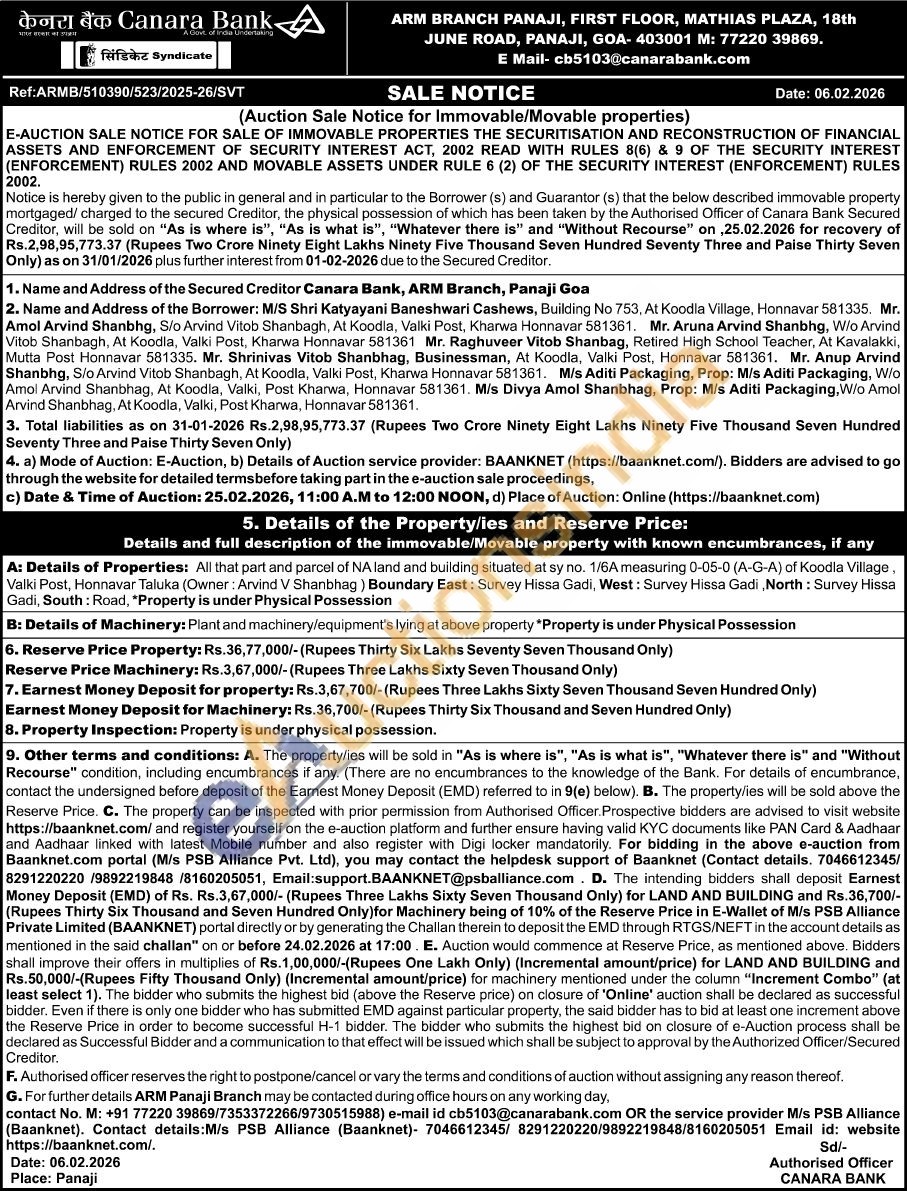 Details of Properties: All that part and parcel of NA land and building situated at sy no. 1/6A measuring 0-05-0 (A-G-A) of Koodla Village. Valki Post, Honnavar Taluka (Owner: Arvind V Shanbhag) Boundary East: Survey Hissa Gadi, West: Survey Hissa Gadi, North: Survey Hissa Gadi, South: Road, "Property is under Physical Possession