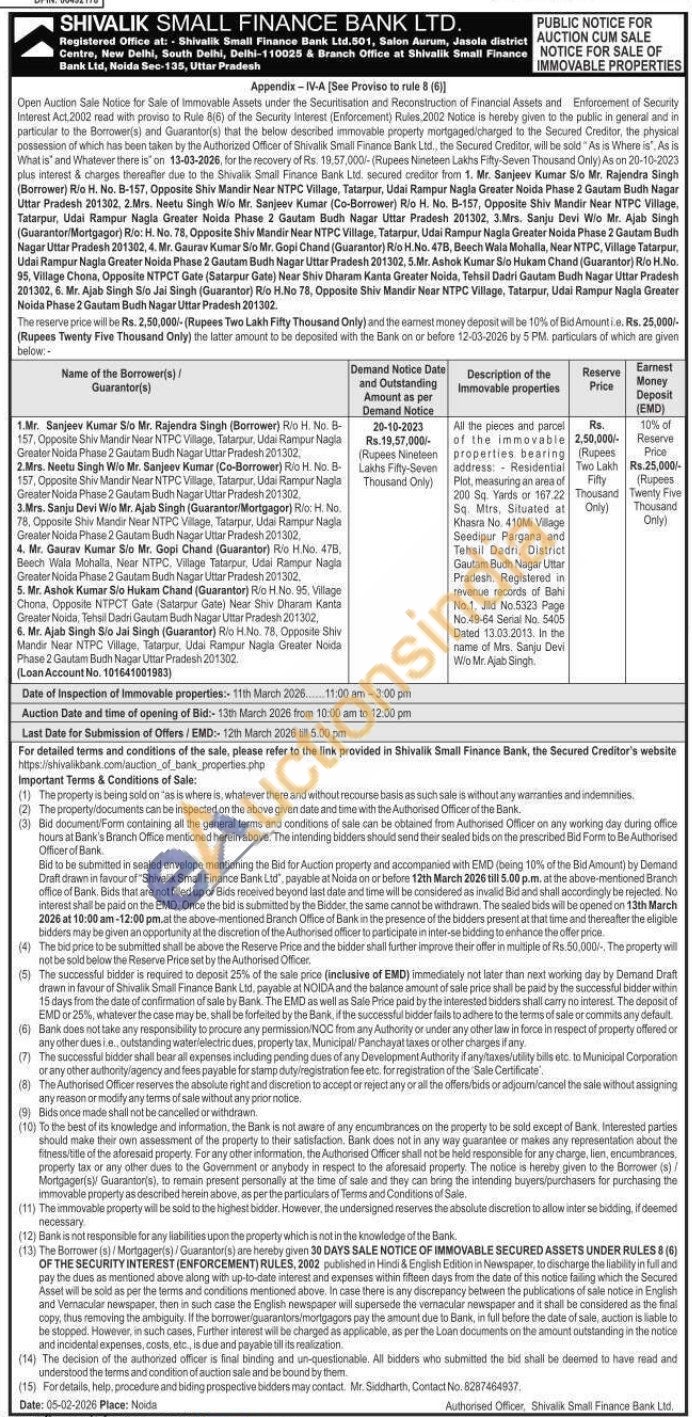 All the pieces and porcel of the immovable bearing properties bearing address: Residential Plot, measuring an area of 200 Sq. Yards or 167.22 Sq. Mtra, Situated at Khasra No. 410M Village Seedipur Pargana and Tehsil Dadri, District Gautam Budh Nagar Uttar Pradesh, Registered in revenue records of Bahi No.1, Jd No.5323 Page No.49-64 Serial No: 5405 Dated 13:00 2013. In the name of Mrs. Sanju Devi Wo Mr Ajsh Singh